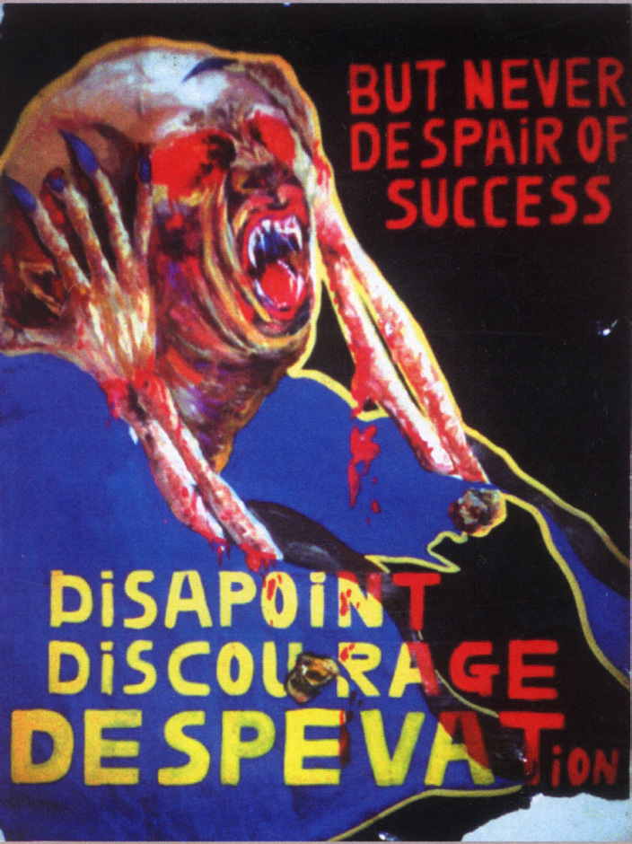 在其他同学紧张备考时,谭恩回到画室,画了两张充满设计感的全开水粉,贴在了画室。这两幅画用美式招贴画极具冲击力的方式,融入金属朋克元素,充当辟邪的“门神”。第一张画是鼓励自己和同学不要放弃,要继续战斗;第二张画则是在26个字母中,少了T和E,这正是“谭恩”二字的首写英文字母,似乎是意味着一切的恐惧都将远离自己。作为一个正在备考的高中生,能将这样的理念融入画中,已经体现了谭恩功底的扎实和与同龄人不一样的视野。